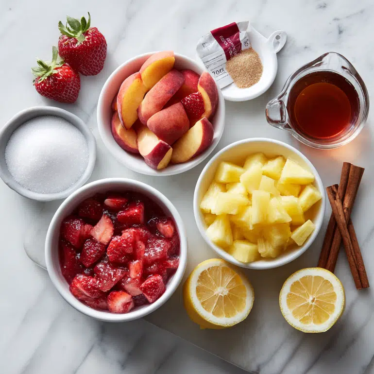 1. In a large bowl, combine 4 cups diced strawberries, 2 cups diced peaches, and 2 cups crushed pineapple with 1/4 cup lemon juice. Toss to coat the fruit.