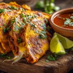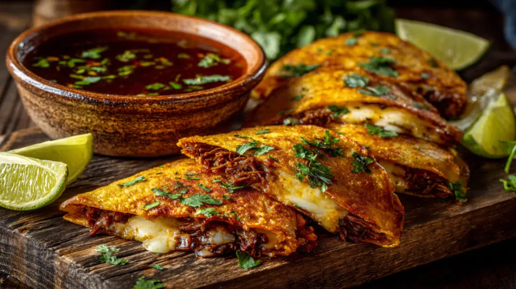 - Heat a skillet, place shredded beef and Oaxacan cheese in corn tortillas, fold, and fry until golden and crispy.