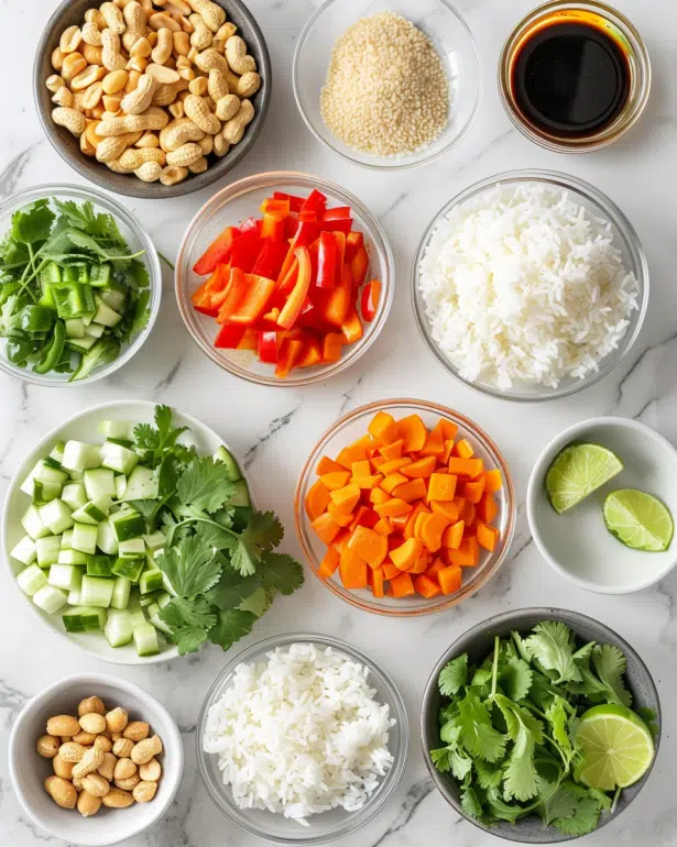 4. Dress It Up: Drizzle that delicious dressing over everything and toss gently to combine. You don’t want to break your crispy rice, so just a light hand here! Top with chopped peanuts for that extra crunch and ta-da! You have a hearty salad ready to serve.