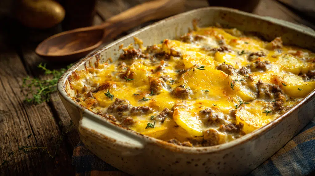 - In a large baking dish, layer the sliced potatoes on the bottom, followed by the cooked ground beef mixture.