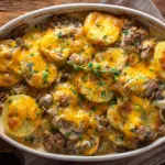 A delicious one-pot meal that’s perfect for busy weeknights, this Hobo Casserole features layers of potatoes, ground beef, cream of mushroom soup, and cheese.