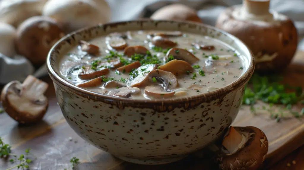 A comforting bowl of mushroom soup that embodies warmth and connection, perfect for family dinners or cozy nights in.