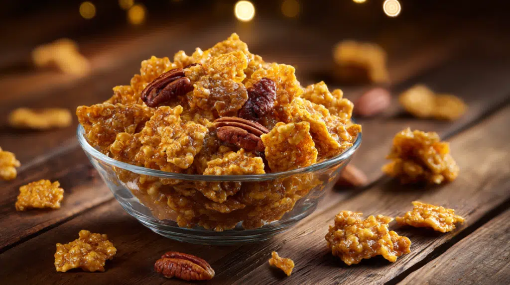 - Drizzle the caramel mixture over the cereal and pecans, ensuring an even coating.