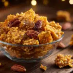 Now, drizzle that heavenly caramel mixture over your cereal and pecans, ensuring an even coating. It’s going to get sticky, but that’s part of the fun!