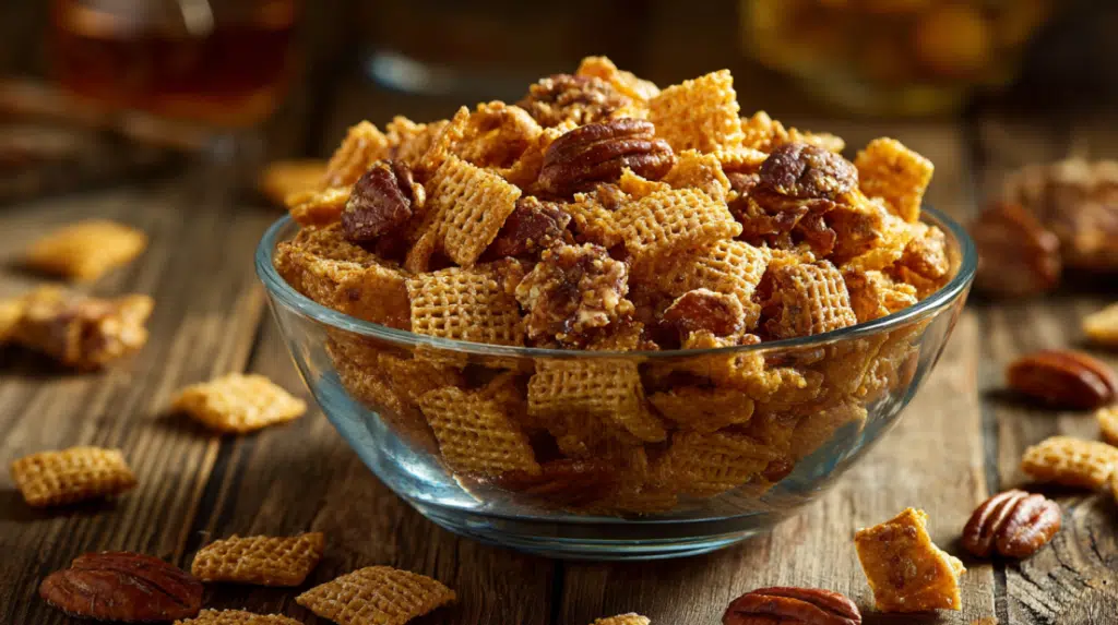 In a large mixing bowl, combine 8 cups of Crispix cereal and 2 cups of pecan halves. Give them a gentle mix, just enough to coat those crunchy gems.